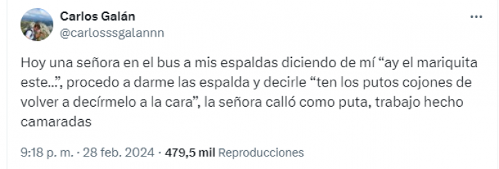 "Una señora en el bus ha dicho sobre mí a mis espaldas 'ay el mariquita ese", ha explicado al incio de la publicación en X, antes conocido como Twitter, que ya cuenta con más de 6.000 'me gusta' en poco más de 24 horas.