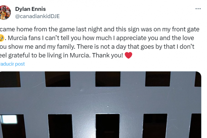 "Anoche llegué a casa después del partido y estaba este letrero en la puerta de entrada 🥹Aficionados de Murcia no puedo expresar lo mucho que os aprecio y el amor que me mostráis a mí y a mi familia. No hay día que no me sienta agradecido de vivir en Murcia. ¡Gracias!", ha contado Ennis en el mensaje que ha publicado.