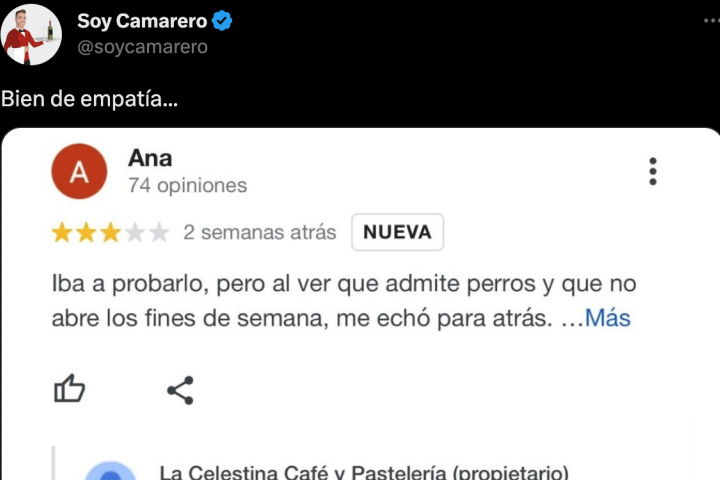 "Iba a probarlo, pero al ver que admite perros y que no abre los fines de semana, me echó para atrás...", ha escrito una persona en Google sobre un loca, que ha puntuado a continuación con tres estrellas.
