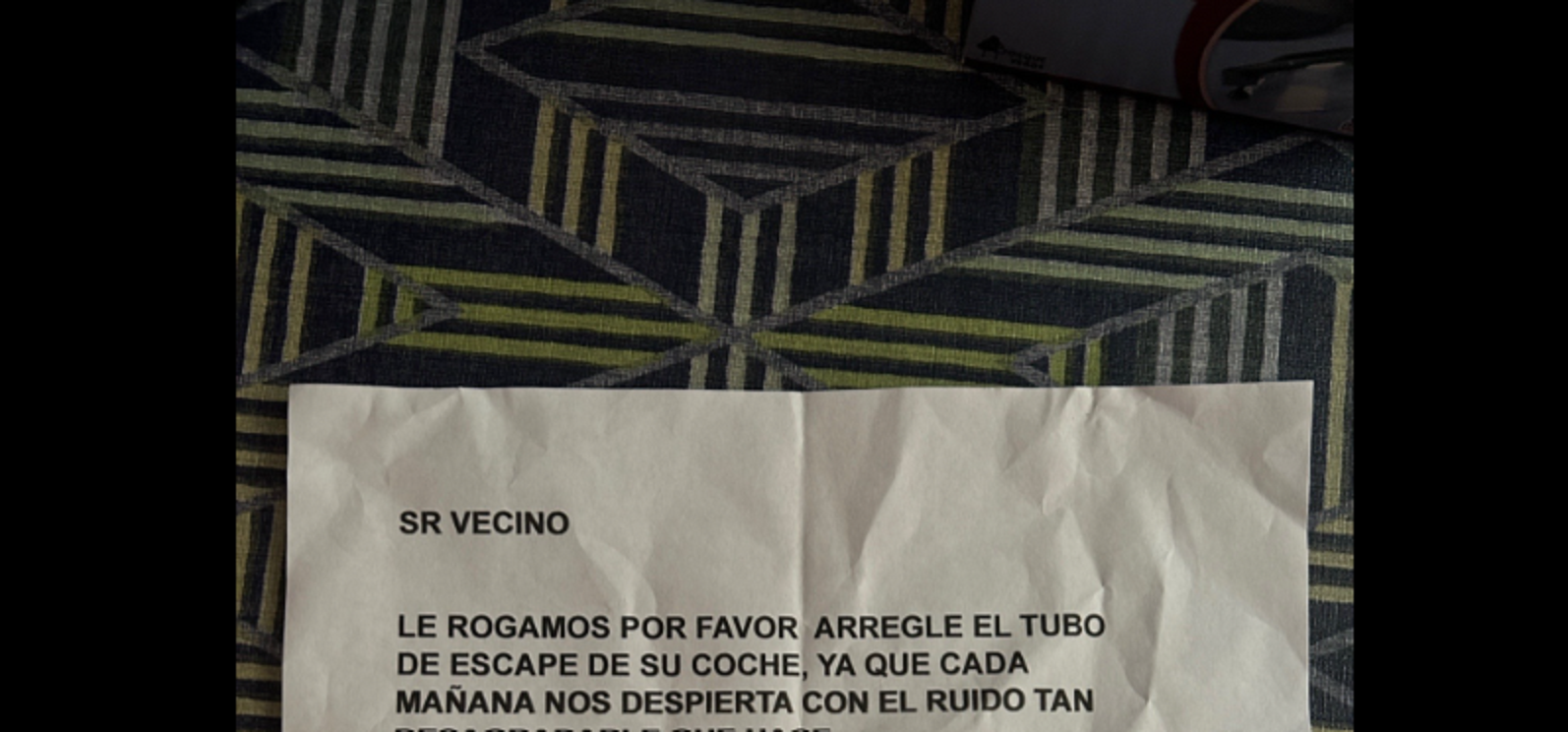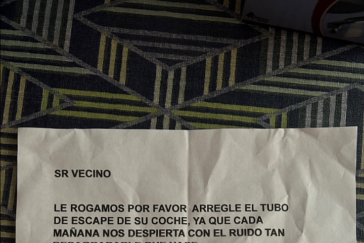 "Señor vecino, le rogamos por favor arregle el tubo de escape de su coche, ya que cada mañana nos despierta con el ruido tan desagradable que hace", se lee en el cartel, donde se agrega: "Se lo pedimos por favor los vecinos".