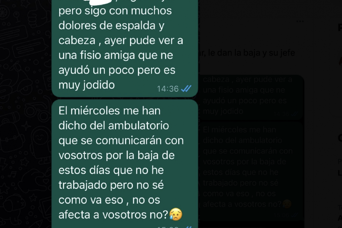 En otro mensaje ha añadido: "El miércoles me han dicho del ambulatorio que se comunicarán con vosotros por la baja de estos días que no he trabajado pero no sé cómo va eso. ¿No os afecta a vosotros no?".