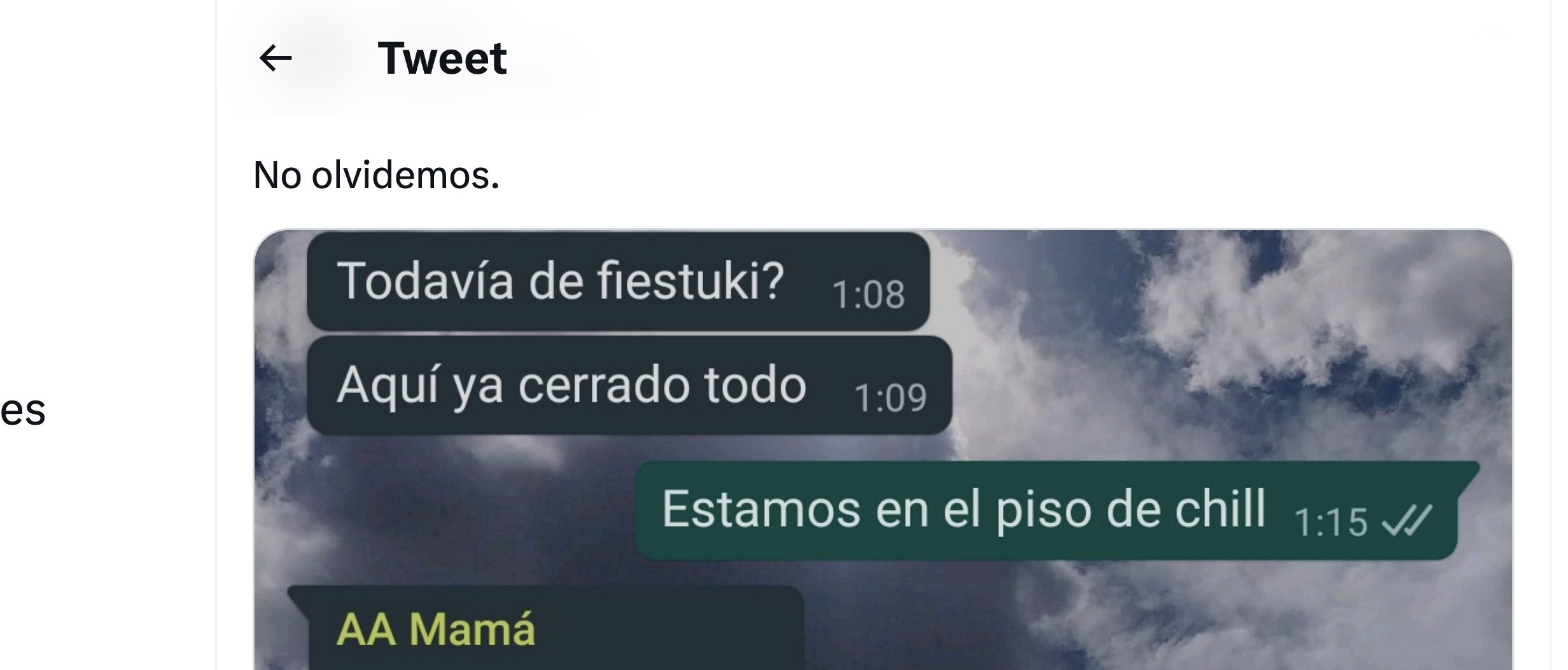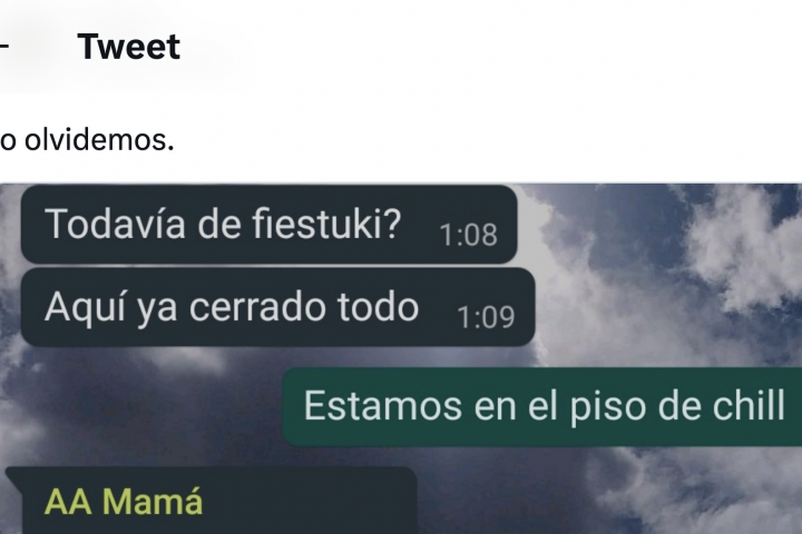 Uno de ellos supera los 20.000 'me gusta' en sólo ocho horas y no es para menos. En la captura que ha compartido una usuaria de Twitter se puede ver que su madre le dice "todavía de fiestuki? Aquí ya cerrado todo".
