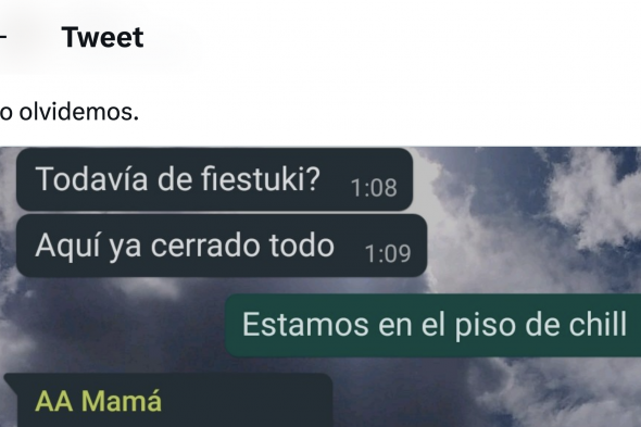 Uno de ellos supera los 20.000 'me gusta' en sólo ocho horas y no es para menos. En la captura que ha compartido una usuaria de Twitter se puede ver que su madre le dice "todavía de fiestuki? Aquí ya cerrado todo".