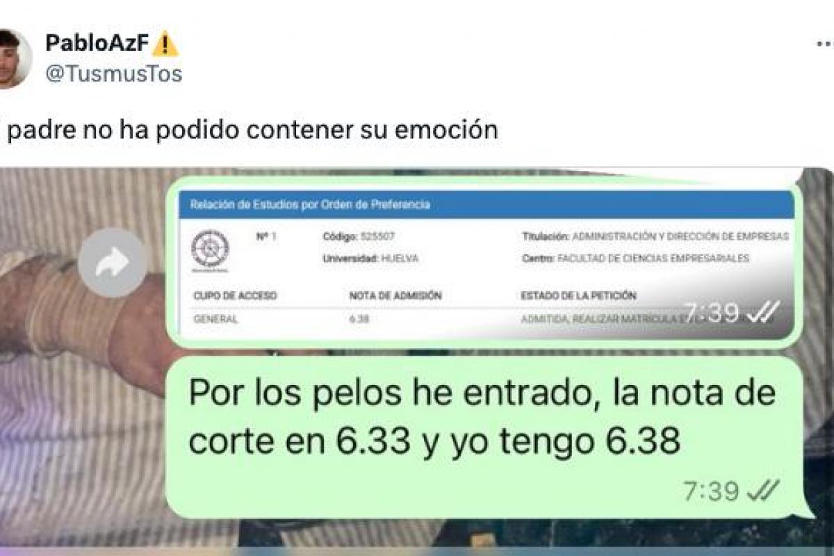 Para celebrar que le habían cogido en la carrera de Administración y dirección de empresas (ADE) en la Universidad de Huelva se lo ha hecho saber a su padre con un pantallazo del documento en el que le informaban que le habían admitido.