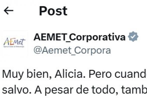 Tras ver el tuit y sin que nadie lo esperara, el perfil corporativo de la AEMET decidió dejar una réplica que suma más de 30.000 'me gusta' en pocas horas. "Muy bien, Alicia. Pero cuando veas un aviso rojo de AEMET, ponte a salvo. A pesar de todo, también trabajamos para ti", ha señalado.