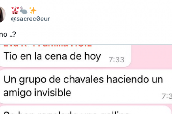 Tal y como ha compartido en un pantallazo de WhatsApp, su contacto le dijo que en una cena había presenciado un amigo invisible en el que se habían llegado a regalar "una gallina en una caja". "Con pienso para gallinas", añadió.