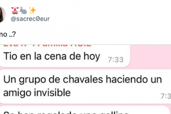 Tal y como ha compartido en un pantallazo de WhatsApp, su contacto le dijo que en una cena había presenciado un amigo invisible en el que se habían llegado a regalar "una gallina en una caja". "Con pienso para gallinas", añadió.