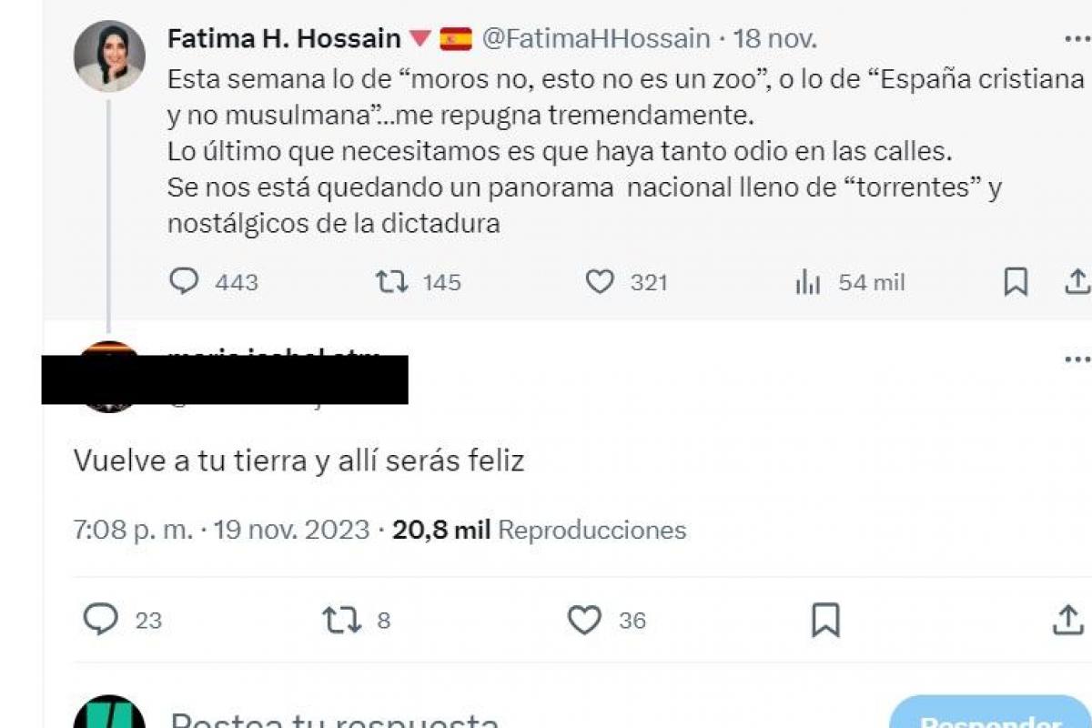 Tras ello, una usuaria le ha respondido: "Vuelve a tu tierra y allí serás feliz". Y Hamed ha respondido tajante: "Vale, volveré a mi tierra. ¡Uy! Que ya estoy en ella, querida. Y ya llevamos algunas generaciones".