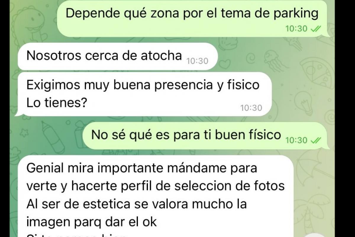 "Exigimos muy buena presencia y físico. ¿Lo tienes?", quiso saber el empleador. La joven respondió en un primer momento: "No sé qué es para ti buen físico". "Genial. Mira, importante, mándame para verte y hacerte perfil de selección de fotos. Al ser de estética se valora mucha la imagen para dar el ok. Si te parece bien", le dijo el empresario.