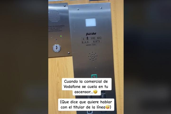 En las imágenes se ve cómo la llamada de una comercial de Vodafone se cuela a través del telefonillo de emergencias de un ascensor. "Cuando la comercial de Vodafone se cuela en tu ascensor...", ha escrito la mujer.