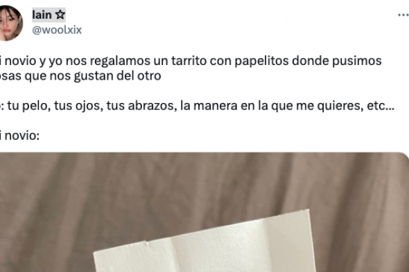 La usuaria de Twitter Lain (@woolxix) está triunfando en las últimas horas en la red social del pajarito al contar lo que le ha escrito su novio en un regalo en el que ambos se cuentan lo que más le gusta del otro.