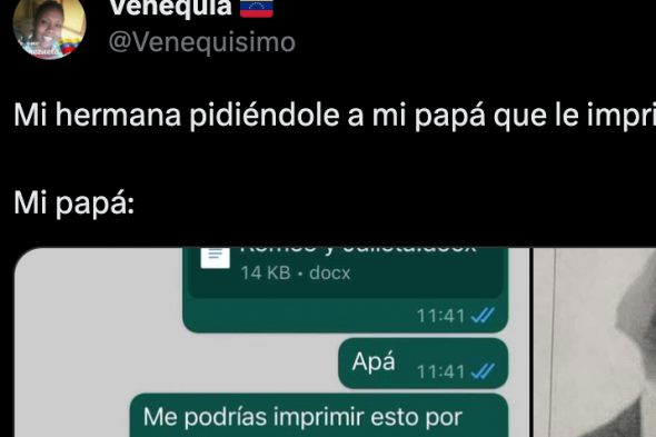 "Mi hermana pidiéndole a mi papá que le imprimiera unas hojas😭", ha escrito junto a la captura, publicación que acumula ya más de 46.000 me gusta. En la imagen, además, se puede ver que su hermana le manda a su padre un archivo llamado Romeo y Julieta y le pide que lo imprima.