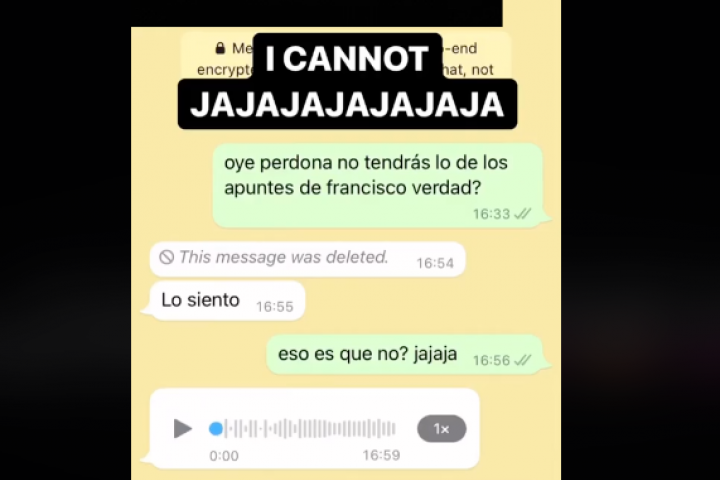 Ahí es cuando Elia insiste en que con eso quiere decir que no. La respuesta que se lleva de su compañera es un mensaje de audio en el que le dice rotundamente que no le va a pasar los apuntes.
