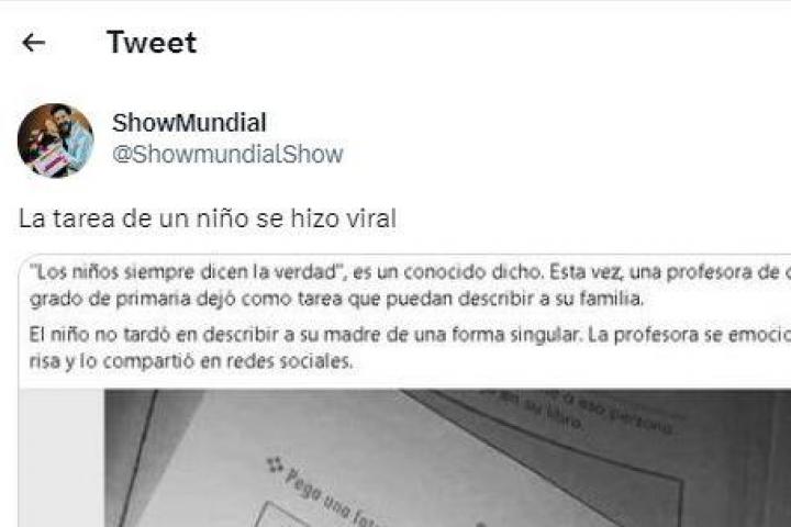 "Una profesora de cuarto grado de Primaria dejó como tarea describir a su familia. El niño no tardó en detallar a su madre de una forma singular. La profesora se emocionó de la risa y lo compartió en redes sociales", han escrito.