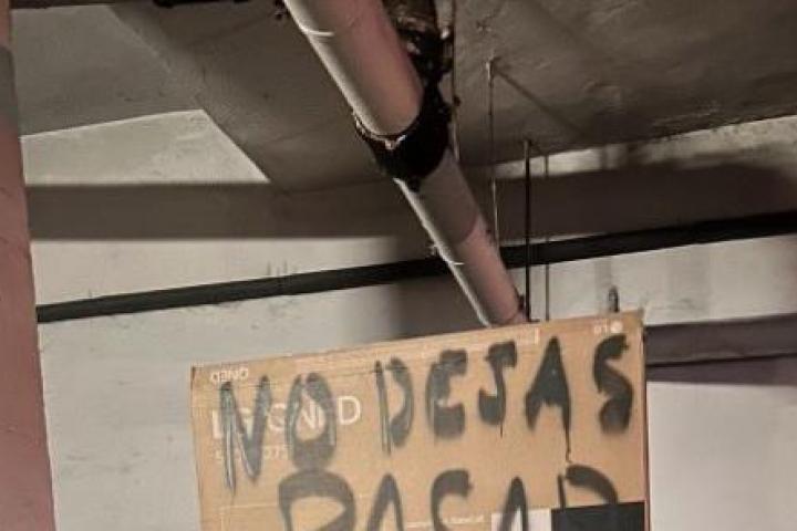 Hay dos fotos. En una de ellas se puede ver a un BMW en una plaza de garaje aparentemente bien aparcado y encima un cartel enorme que dice en color negro y en mayúsculas: "No dejas pasar".