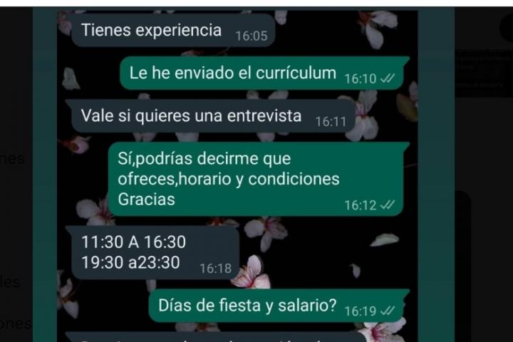 Se trata de la conversación que ha tenido por WhatsApp una aspirante a trabajar en un local. Se ve cómo la empleada dice al propietario que le ha enviado el currículum y, de paso, le pregunta por las condiciones del puesto y el horario.