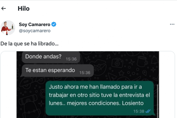 La conversación ha provocado numerosas reacciones de indignación por la violencia verbal del hostelero, pero también porque muchos consideran que la empleada no se comportó bien. El propio @soycamarero, ante las críticas, ha aclarado el contexto: "Ella iba a hacer la entrevista a ese lugar y una prueba, le llamaron de un trabajo con mejores condiciones cuando iba de camino y aviso cuando pudo".