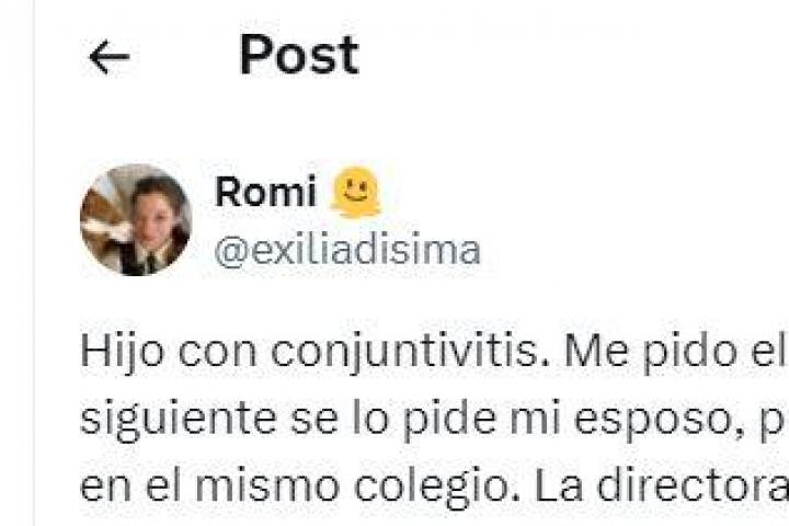 La usuaria de X @exiliadisima trabaja en el mismo colegio que su pareja y los dos han tenido que pedirse un día libre (distinto) debido a que uno de sus hijos había contraído conjuntivitis.