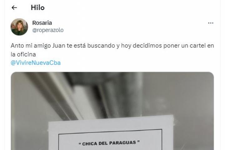 Y este es el supuesto mensaje que el amigo de la tuitera ha escrito para Anto: "En noviembre de 2016 te acompañé por Chacabuco hasta tu departamento. Llovía y te presté mi paraguas. Me llamo Juan y te estoy buscando desde ese día".
