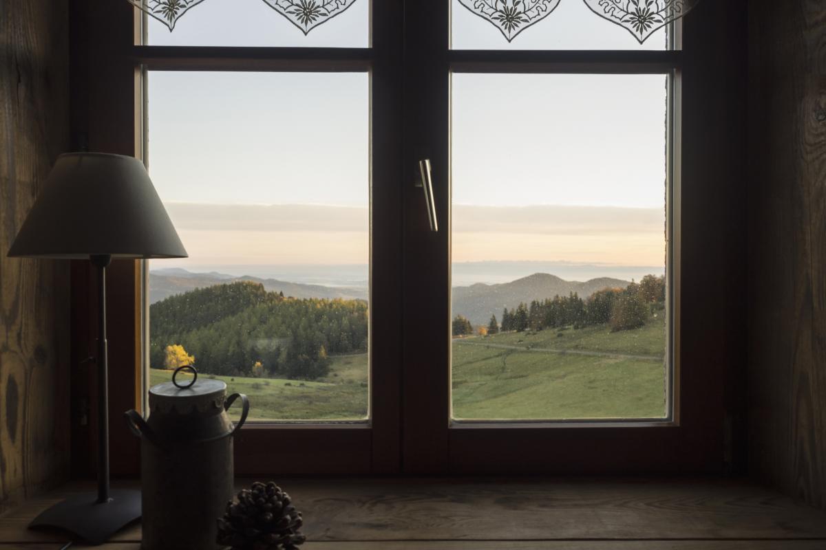 Vista por una ventana desde el interior de una casa rural.