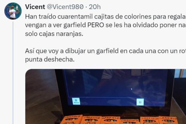 "Han traído cuarentamil cajitas de colorines para regalar a los niños que vengan a ver Garfield PERO se les ha olvidado poner nada de la peli. Son solo cajas naranjas", ha explicado en la publicación.