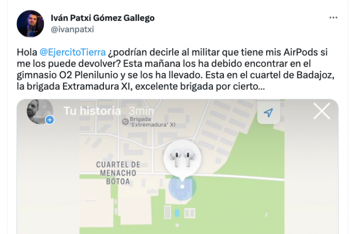 Hola @EjercitoTierra ¿podrían decirle al militar que tiene mis AirPods si me los puede devolver? Esta mañana los ha debido encontrar en el gimnasio O2 Plenilunio y se los ha llevado", ha escrito.