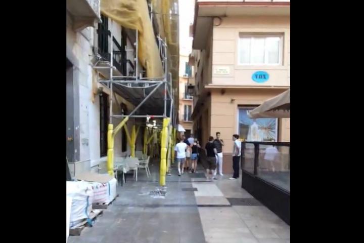 "Me he dado cuenta que hay un andamiaje en todo el edificio porque están restaurando la fachada y están poniendo sillas y mesas de terrazas bajo un andamio de una obra, no sé si es legal o no. No sé hasta qué punto tiene cierta seguridad y vemos como todo el bar se ha metido debajo del andamiaje, desconozco el tema de legalidad, pero cuanto menos interesante es", ha asegurado el autor del vídeo, mientras recorría la calle.