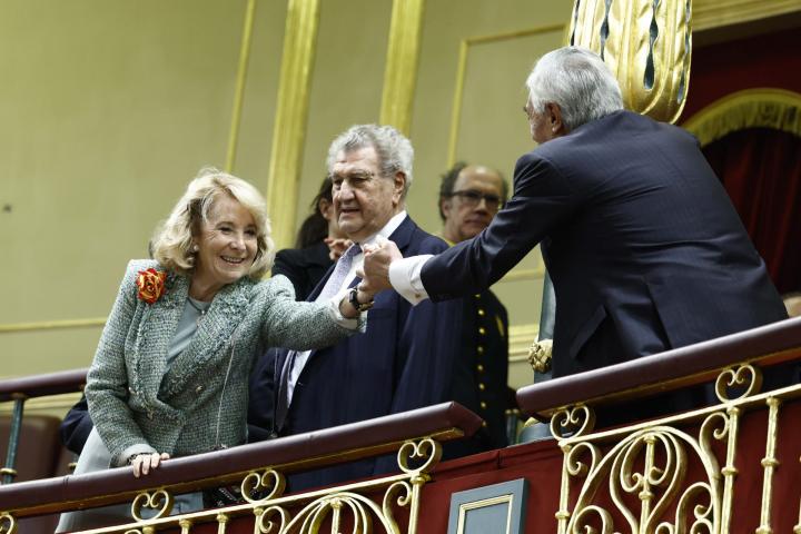 Tras la sesión solemne de la apertura oficial de la XV Legislatura, los diputados del Congreso y el Senado han recorrido en fila por el pasamanos de los monarcas. Mientras todos han seguido el protocolo estrechando la mano de Felipe VI, Letizia y la princesa Leonor, Aguirre les ha reverenciado.