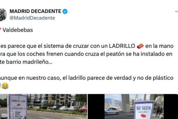 "Pues parece que el sistema de cruzar con un LADRILLO 🧱 en la mano para que los coches frenen cuando cruza el peatón se ha instalado en este barrio madrileño…aunque en nuestro caso, el ladrillo parece de verdad y no de plástico", afirma.