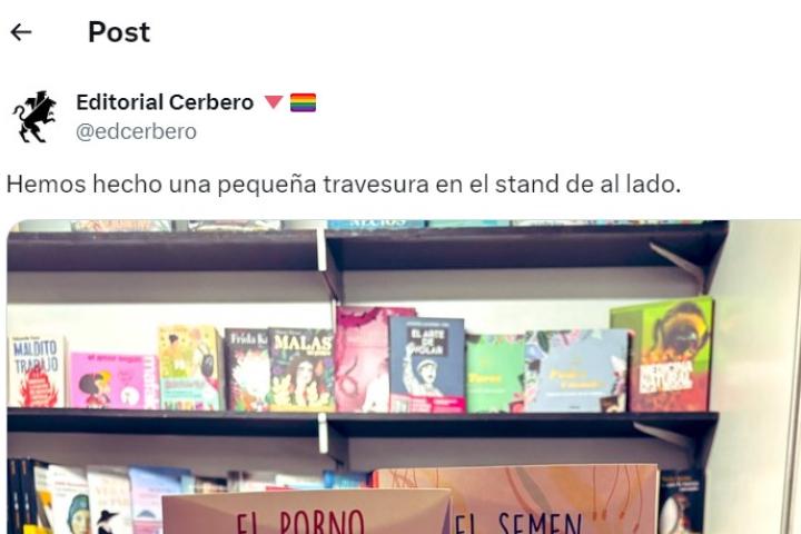 "Hemos hecho una pequeña travesura en el stand de al lado", han escrito junto a la foto, que aparentemente está tomada en una de las típicas casetas de una Feria del Libro.
