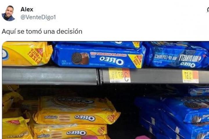 "Aquí se tomó una decisión", ha escrito el tuitero, junto a la foto de una estantería de un supermercado en el que se pueden ver que hay galletas Oreo de todo tipo de sabores, desde las clásicas hasta las Golden. Sin embargo, hay un hueco libre en el estante donde alguien dejó dos mancuernas pequeñas de color rosa.