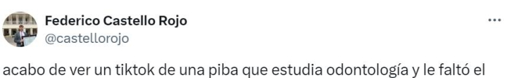 La estudiante debía sí o sí realizar una extracción molar, pero el paciente acabó faltando de última hora. "Le faltó y entonces para poder aprobar el práctico le pidió al novio que sea su paciente y le sacó una muela", ha dicho perpléjica el usuario de X, antes conocido como Twitter, @castellorojo.