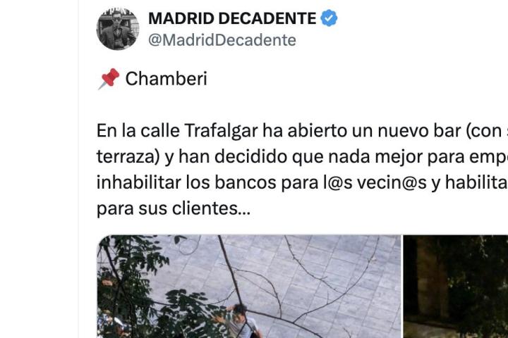 "En la calle Trafalgar ha abierto un nuevo bar (con su correspondiente terraza) y han decidido que nada mejor para empezar su andadura que inhabilitar los bancos para l@s vecin@s y habilitarlos como asientos para sus clientes…", se puede leer en la cuenta.