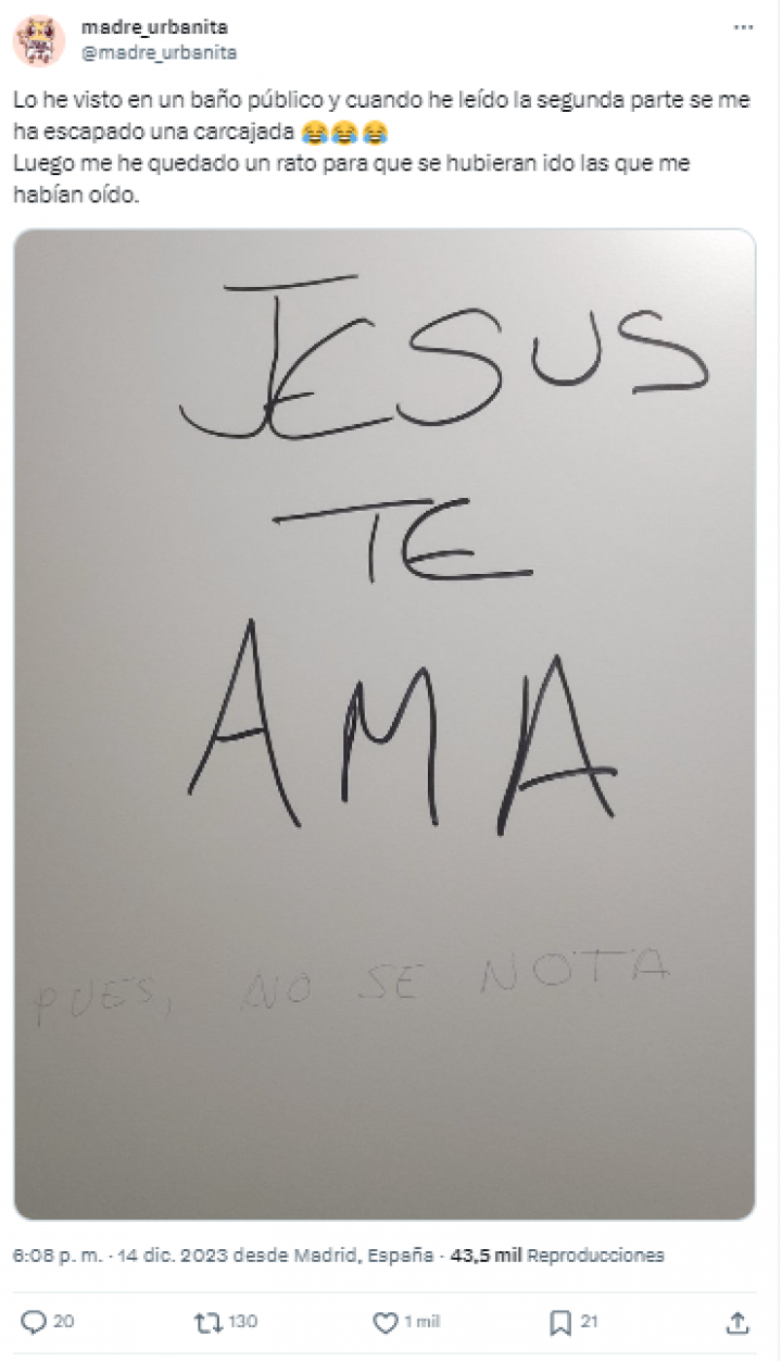 Junto a estas palabras ha publicado una fotografía de lo que ha visto. En primer lugar, y en letras más grandes y claras se lee: "Jesús te ama". Sin embargo, debajo de esto y en tono más suave, alguien añadió: "Pues, no se nota".