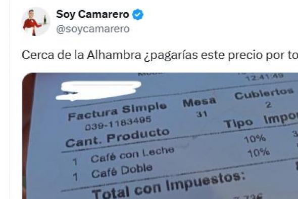 "Cerca de la Alhambra ¿pagarías este precio por tomar allí unos cafés?", ha preguntado la cuenta junto a una foto de una cuenta en la que se habían pedido dos cafés, uno con leche y otro doble. El precio ha impactado.