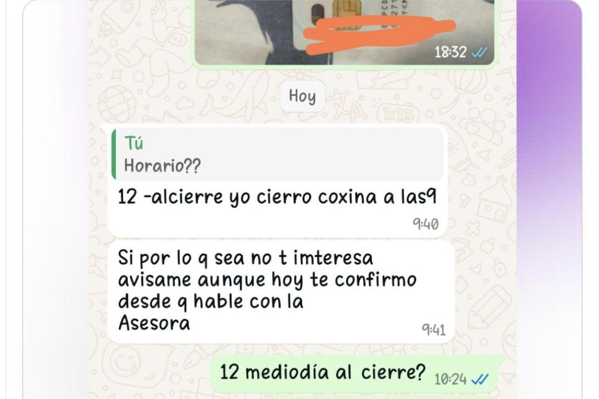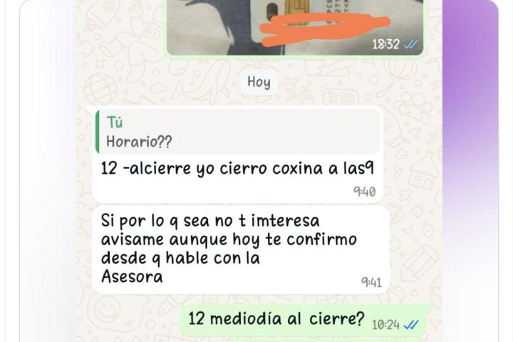 Como en cualquier oferta, la persona interesada le pregunta al jefe por el horario. En este caso es de 12 de la mañana al cierre y la cocina se cierra a las 21:00: "Si por lo que sea no te interesa avísame aunque hoy te confirmo desde que hable con la asesora".