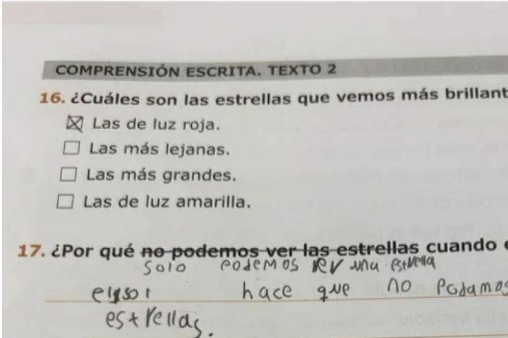 En el examen de Castellano hay una pregunta que dice: "¿Por qué no podemos ver las estrellas cuando es de día?". El estudiante hace una raya sobre la pregunta y pone: "¿Por qué sólo podemos ver una estrella cuando es de día?".