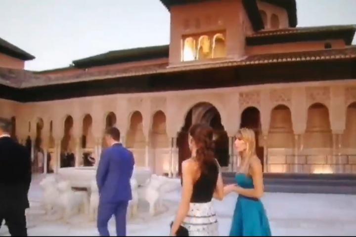 Don Felipe y doña Letizia han sido recibidos a su llegada a La Alhambra por el presidente del Gobierno en funciones, Pedro Sánchez, y su esposa, Begoña Gómez, en los Jardines del Partal.