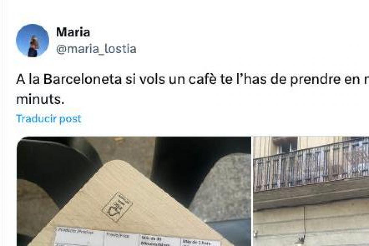"En la Barceloneta si quieres un café tienes que tomarlo en menos de 30 minutos", ha escrito la tuitera, que ha acompañado su tuit con dos fotos: una de esa lista de precios y otra de la puerta del local.