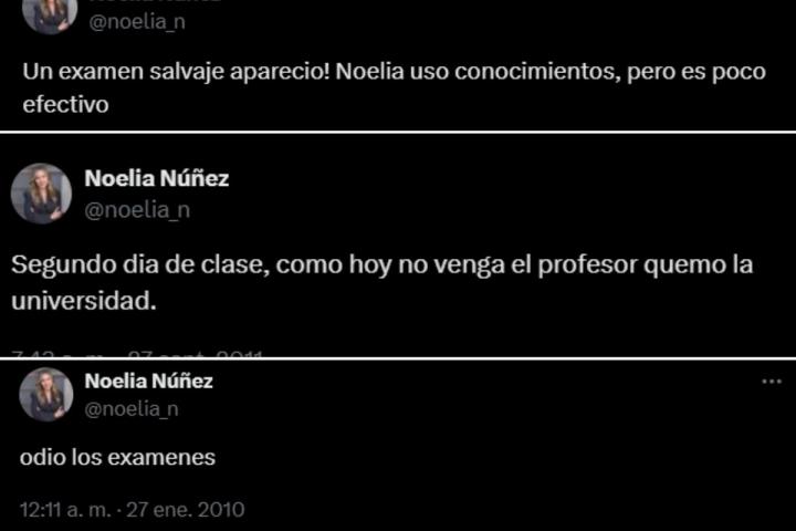 "Un examen salvaje apareció! Noelia usó conocimientos, pero es poco efectivo", escribía Núñez en junio de 2011. "No soporto a la gente que habla como si fuese licenciado en derecho, twitter está lleno de supuestos juristas, jueces y abogados 'expertos'", "estoy harta de estudiar" o "a la uni a tomar el sol :) jajajaj" son otros ejemplos.