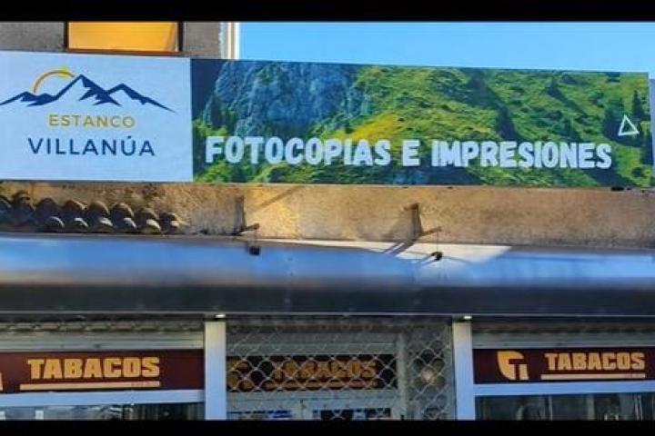 Durante la grabación se puede ver una pantalla gigante encima del estanco Villanúa en la que se anuncia información varia sobre el establecimiento, como los productos que venden o sus horarios.
