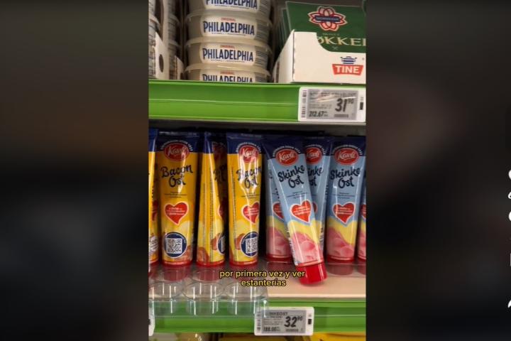 "¿Por qué a los noruegos les encanta la comida en tubo? Como española viviendo en Noruega me llamó muchísimo la atención entrar en un supermercado por primera vez y ver estanterías repletas de queso, caviar, pollo... todo servido en tubos", explica mientras muestra estanterías de supermercados llenas de estos productos.