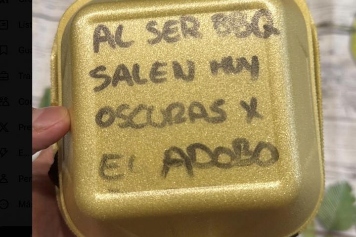 "Al ser bbq [barbacoa] salen muy oscuras por el adobo", reza en rotulador y en mayúsculas.