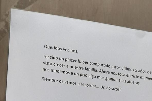 "Queridos vecinos, ha sido un placer haber compartido estos últimos cinco años de nuestra vida donde habéis visto crecer a nuestra familia. Ahora nos toca el triste momento de la despedida ya que nos mudamos a un piso algo más grande a las afueras", dice la carta.