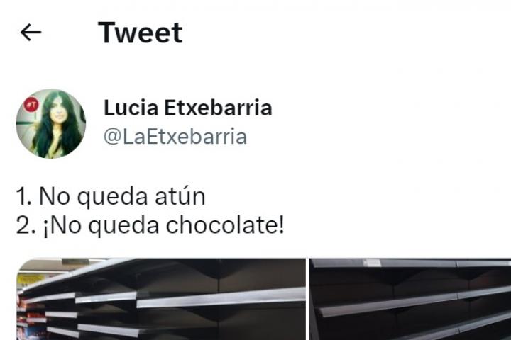 "1. No queda atún. 2. ¡No queda chocolate!", ha asegurado la autora en redes sociales, denunciando la falta de algunos productos en la tienda a la que había acudido.