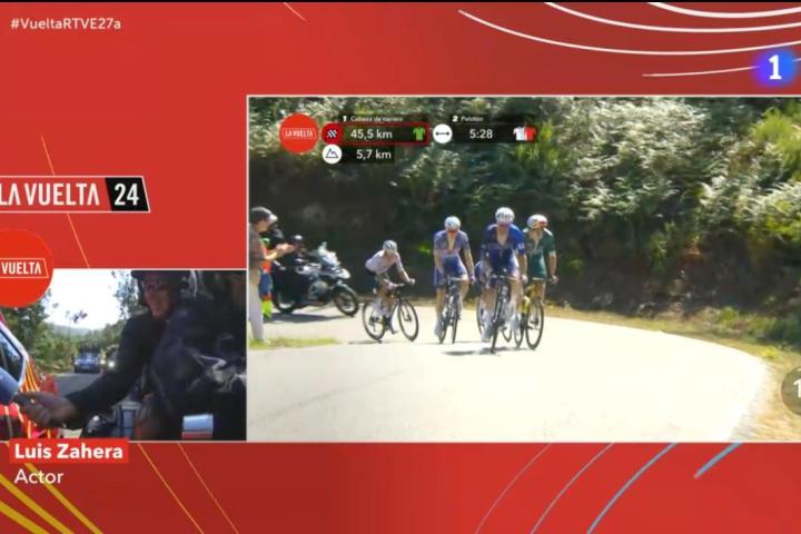 El actor Luis Zahera se ha colado en la retransmisión de RTVE de La Vuelta a España y ha tenido un cómico momento con el periodista que lo ha entrevistado desde la moto en esta décima etapa de 159,6 km que va desde Ponteares a Baiona.