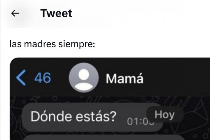 En esta ocasión más de 1,3 millones de personas han visto ya los mensajes que la madre de un tuitero le mandó de madrugada, a eso de la 1:00. "¿Dónde estás?", le dice concretamente a las 1:05 de la madrugada.