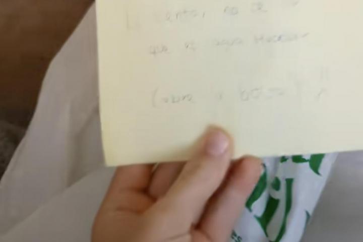 En las imágenes se puede cómo su novio entra al salón temblando y con una bolsa de plástico en la mano, la deja el sofá y sale corriendo. Ella coge la nota sorprendida y la lee en voz alta para el vídeo, lo que pone ahí es la clave del éxito.