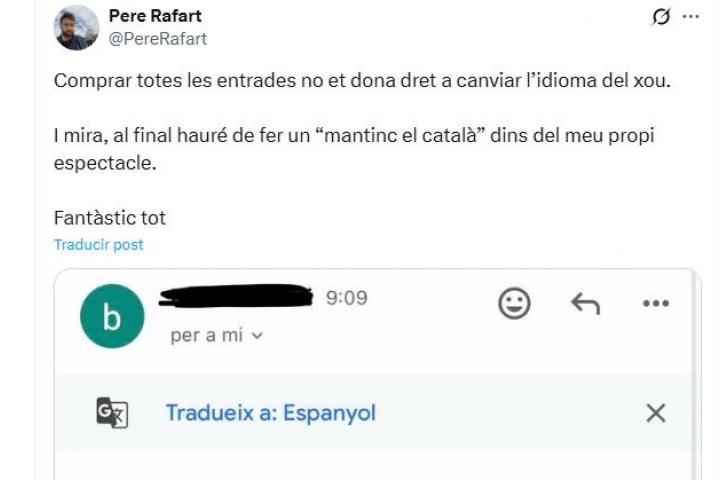 Sin embargo, a Rafart esta petición no le ha gustado porque, según ha comentado, no tienen derecho a cambiar el espectáculo. "Comprar todas las entradas no te da derecho a cambiar el idioma del show. Y mira, al final tendré que hacer un ‘mantengo el catalán’ dentro de mi propio espectáculo", ha sentenciado, acabando su tuit con un irónico "fantástico todo".