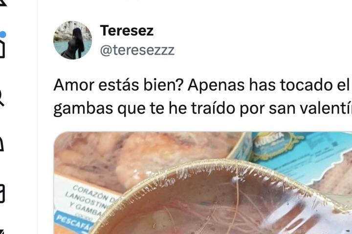"¿Amor estás bien? Apenas has tocado el corazón de langostinos y gambas que te he traído por san valentín", ha dicho ella a modo de chiste junto a la imagen con la caja de 400 gramos de marisco.